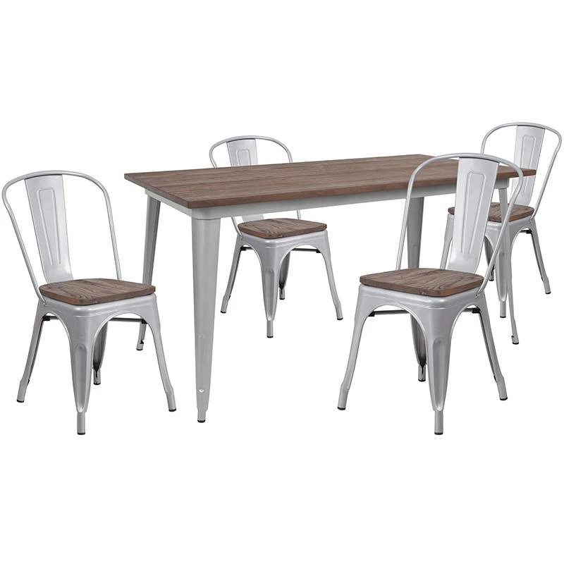 The trendy metal dining table with stack chairs will give your dining room or bar a refreshing rustic feel with its wood features.The table has a shiny metal frame that is topped off with an appealing textured wood top. The stackable bistro style chairs feature curved backs with a vertical slat and a cross brace under the seat for added support and stability. Plastic bumpers on the cross brace protect the chairs’ finish from scratches when stacking them and rubber floor glides protect your floor by sliding smoothly when you need to move them.Designed for both commercial and residential use, this trend-setting table set is a great choice for your restaurant’s dining area or your kitchen at home. [CH-WD-TBCH-13-GG]