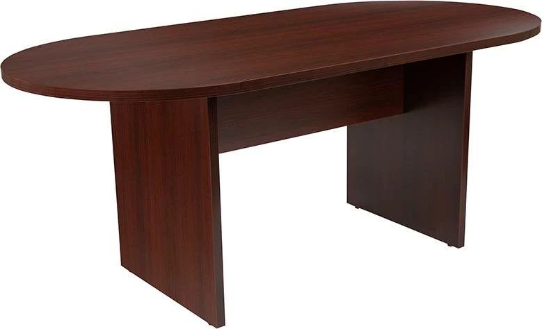 Have a dedicated meeting space for your staff to discuss projects and brainstorm around this classic conference table. The 6′ conference room table is sized perfectly for small groups with seating for six. The boardroom table is shaped appropriately to be seen by each member as they provide their verbal input. Panel legs have screw-in adjustable feet to level the unit on uneven floor surfaces while the middle panel adds stability. Laminate surfaces are easy to wipe clean whether used frequently or on occasion. If you have a large enough space in your office this racetrack conference table will give you a dedicated meeting space without having to leave the office. Bring your team together on a regular basis when you have a true conference space where everyone is comfortable bringing their ideas to the table.
