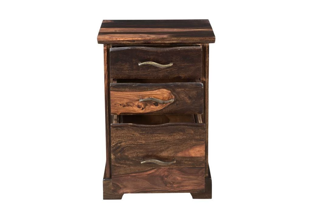 Sleek, simple lines and a rich finish make this cabinet a stylish addition to your home office. It has three live edge drawers that offer plenty of space to keep your items organized and out of sight. Clean lines and metal handles complete the look. Constructed with slabs of solid sheesham wood, this piece is durable and made for long-lasting storage.
