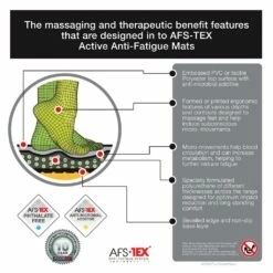 AFS-TEX 2000 Active Anti-Fatigue mats are designed to provide the ultimate standing surfaces combining prolonged comfort and effective body support. The AFS-TEX 2000 incorporates a design to encourage the changes in standing positions. Regular movement stimulates blood flow, increase the body’s metabolism and helps with further fatigue relief. Effective 24/7 for the life of the product. Non-toxic and phthalate free. Ideal for office or home use.