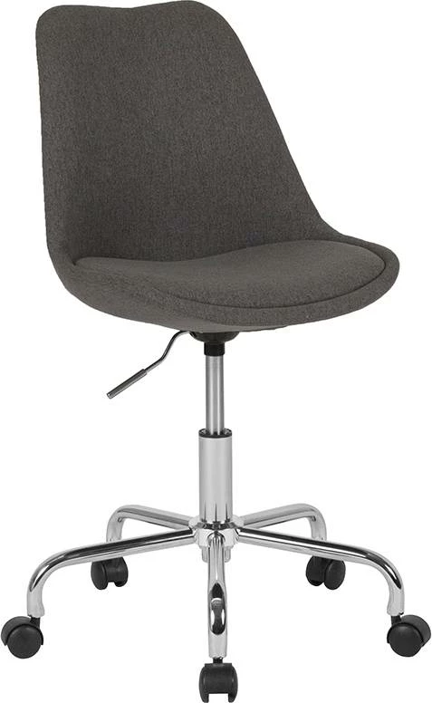 Trendy best describes this swivel task chair to enliven all work spaces.The tapered back design adds character to this desk chair. It’s upholstered in a colorful fabric and has a fixed seat pad. The mid-back chair features a molded design that is created to support the mid-to-upper back region. Chair swivels 360 degrees to get the maximum use of your workspace without strain. The pneumatic adjustment lever will allow you to easily adjust the seat to your desired height. This office chair has a chrome base with dual wheel casters that makes it easy to roll across the floor.The colorfully upholstered task chair is a great choice for your work or home office.