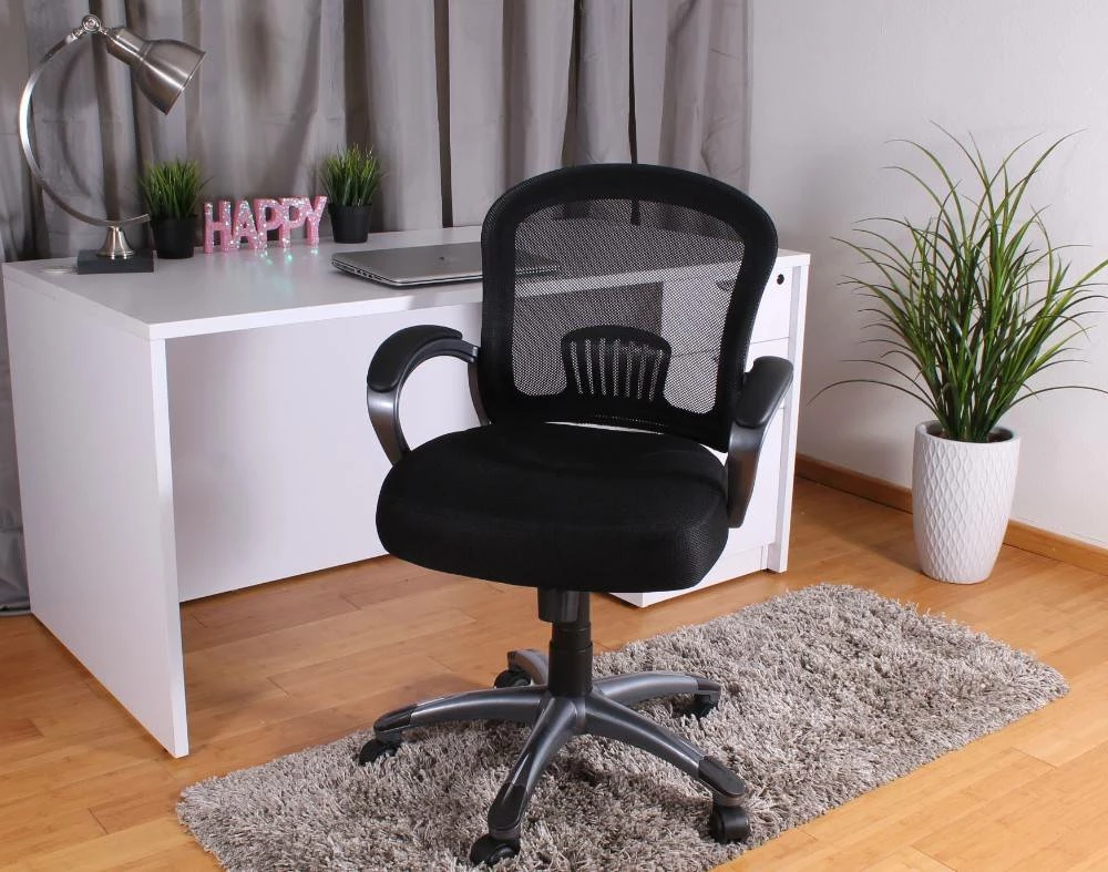 Mid back mesh chair. Ergonomic lumbar support. Loop arms padded with Black CaressoftPlus. 4″ padded mesh seat cushion. Upright locking position. Adjustable tilt tension control. Pneumatic gas lift seat height adjustment. Gun Metal finish base with black caps. Hooded double wheel casters.