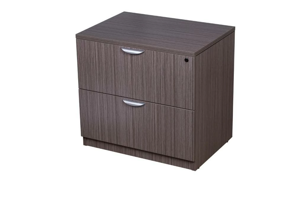 The two drawer locking lateral file come full assembled and can be used either free standing or under a desk shell. The floor glides allow for application where the flooring may not be perfectly level. It is finished in the Driftwood laminate.