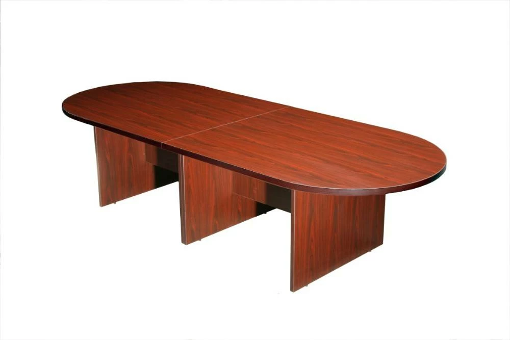 Ten foot racetrack style Mahogany laminate conference table. Affords eight people adequate workspace for meetings and other gatherings. Chips in two cartons.