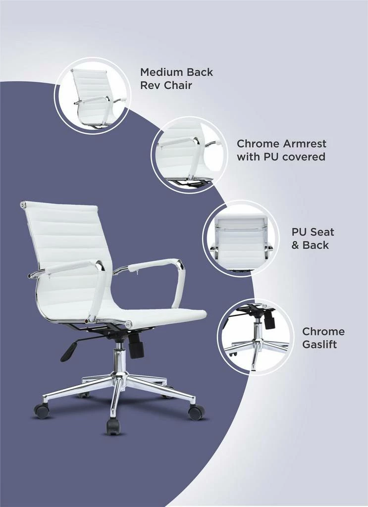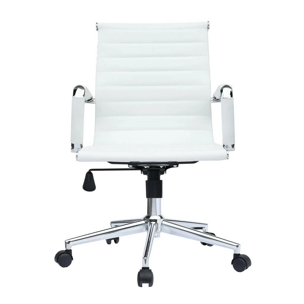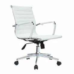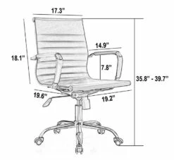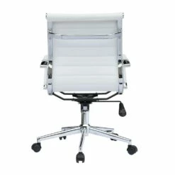 Its medium back revolving and chrome armrests allow you to have a healthy and comfortable position for your back. Also, because of its chrome gas lift, it will enable to adjust the chair’s height so anyone can put their feet flat on the floor to have a better lumbar position and avoid any back problems The seat and the back of the chair is covered by polyurethane in a white finish Product dimensions are 16.70″W x 19.30″D x 35.8-39.8″H