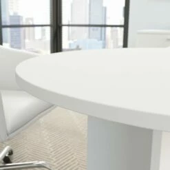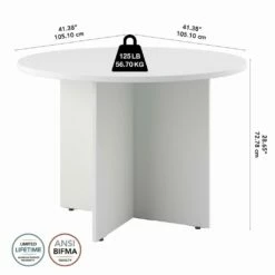 Bring your team together in a private or open plan office with the Bush Business Furniture 42W Round Conference Table. At just the right size, this small meeting table provides ample room for up to 4 users to collaborate with laptops, paperwork and other materials without taking up too much floor space. A durable thermally fused laminate work surface with continuous edge banding protects against scratches, stains, nicks and dings throughout years of daily meetings while a finished underside helps prevent snagged clothing. The conference room table is supported by a sturdy wooden base for a weight capacity of 125 pounds, making it great for use in a breakroom, training area or education space in addition to the office. Your choice of Natural Maple, Harvest Cherry, Hansen Cherry, Mocha Cherry, Storm Gray, Platinum Gray and White finishes coordinate with a broad selection of commercial-grade chairs, storage and accessories to complete your meeting area. This small office table is tested to meet ANSI/BIFMA quality standards for safety and performance and is backed by a Limited Lifetime Warranty. Bush Business Furniture Conference Tables are available in a variety of styles and sizes to complement any professional environment. American made with U.S. and imported parts.