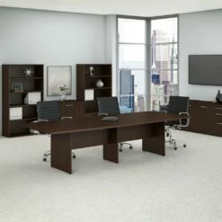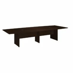 Bring everyone together in an open or private work environment. When you need space to spare specify the Bush Business Furniture 120L x 48W Boat Top Conference Table. Large shaped top surface works in a variety of settings from conventional to alternative office environments. Finished underside prevents snagged clothing. Wood Leg Base, with stable cross-member support system, includes a leveling guide for uneven floors. Wire management port keeps unsightly cords and cables contained. Continuous edge banding protects against nicks and dings from collisions. thermally fused laminate finish resists stains and scratches. Get executive sophistication with practical functionality. Complete with all connectors and mounting plates for installation. Includes Bush Business Furniture limited lifetime warranty. American made with U.S. and imported parts.