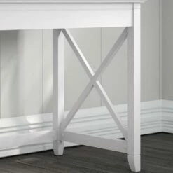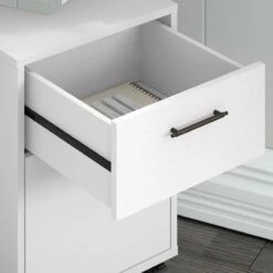 The Bush Furniture Key West 60W L Shaped Desk with Mobile File Cabinet turns any room into a practical home office with easy going style. Save floor space in compact areas by rolling the Cabinet under the Desk and placing the set in a corner, or make use of the fully finished backs to take a prominent position in the middle of the room. At 60W x 60D, the durable work surface is spacious enough to spread out with a computer, paperwork and more when taking on your task of the day. A sturdy post leg design with unique X pattern accents on the side panels creates a relaxed, open appearance while quality construction and materials allow the corner desk to support up to 200 pounds. The 2 drawer filing cabinet rolls on dual-wheeled casters and locks into place for secure positioning. The file drawer opens on full-extension ball bearing slides and accommodates letter size documents while a box drawer provides storage for office supplies and utensils. Available in your choice of Bing Cherry, Washed Gray or Pure White Oak finishes with Aged Bronze drawer pulls, this L shaped computer desk with storage coordinates with a wide range of products including Desktop Organizers, a Lateral File Cabinet and a 5 Shelf Bookcase (all sold separately) to complete your personal workspace with laid back charm of farmhouse . This home set is tested to meet ANSI/SOHO quality standards for safety and performance and is backed by the Bush Furniture 1 Year Manufacturer’s Warranty.
