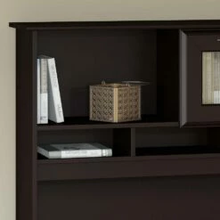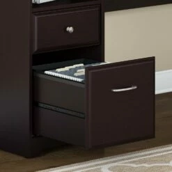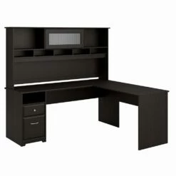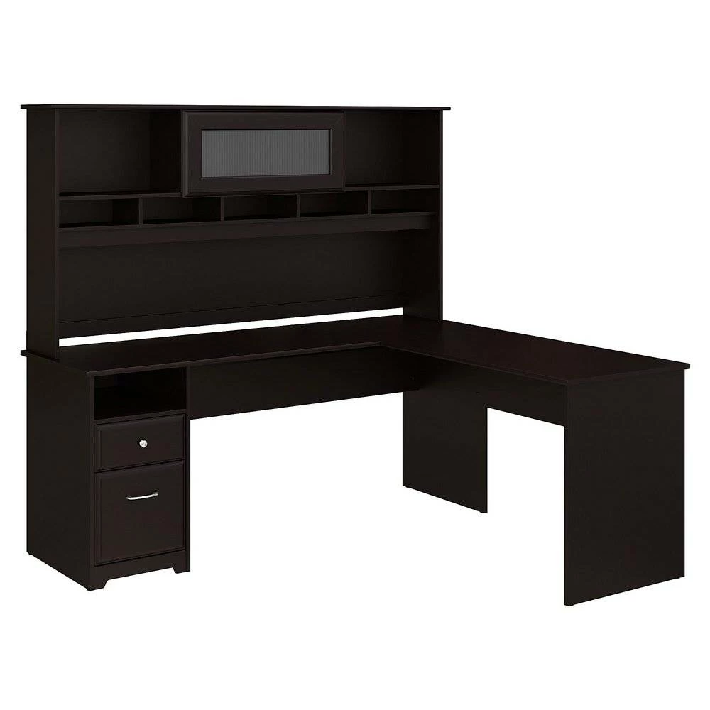 Create a stylish, functional and organized home office with the Bush Furniture Cabot 72W L Shaped Computer Desk with Hutch and Drawers. The spacious work surface allows you to spread out with your laptop, papers, printer and more with room to spare. Store files and supplies in the included drawers and open cubby shelf, designed for quick and easy access. A smooth full-extension drawer opens effortlessly on reliable ball bearing slides so you’ll have no trouble reaching your letter or legal-size files. Beautiful Chrome-finished hardware is the perfect match for the Espresso Oak or Harvest Cherry finish, and the space-saving desk design is ideal for placement in a corner. The Hutch offers an eye-catching flip-up door and includes open storage space for books or decorations. Backed by a Bush Furniture 1 Year Manufacturer’s Warranty, the L Shaped Computer Desk with Hutch and Drawers meets ANSI/SOHO quality test standards for safety and performance. See the full collection of coordinating home furnishings, and design your dream office with the elegant and efficient Cabot Collection.
