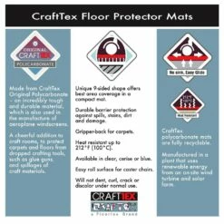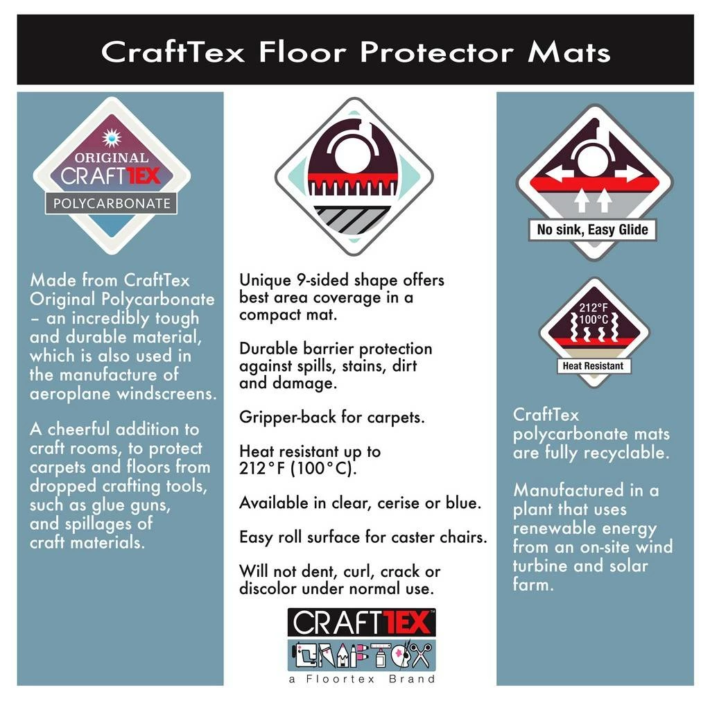 CraftTex 9Mat is suitable for compact craft areas. Its unique nine-sided shape provides excellent floor coverage and protection. This mat is made from strong polycarbonate which will not crack, dent, discolor, curl or smell. Perfect for a child’s room or small craft areas. This chair mat is recyclable, environmentally safe, free from PVC and toxic chemicals. Polycarbonate 9 sided mat to protect floors from messy craft activities. These mats are available for both carpeted and hard floors.