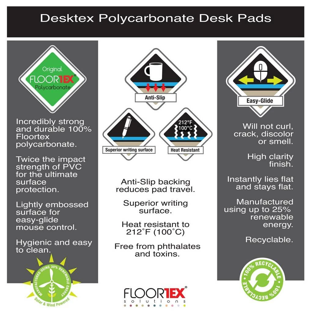 Desktex Anti-slip Polycarbonate is the ultimate in durable plastic surface protection from our desk pad range, made from strong polycarbonate – the material used in the manufacture of aircraft windscreens and bulletproof glass. Simply wipe clean with a damp cloth to remove any dirt build up. Our products are designed to perfectly preserve the condition of every surface they cover. All Polycarbonate and PVC desk pads in the Desktex range are fully recyclable and are manufactured in our facility which obtains 25% of its energy requirements from renewable sources. Proudly designed and manufactured in the UK. Mat size may vary slightly due to manufacturing process.