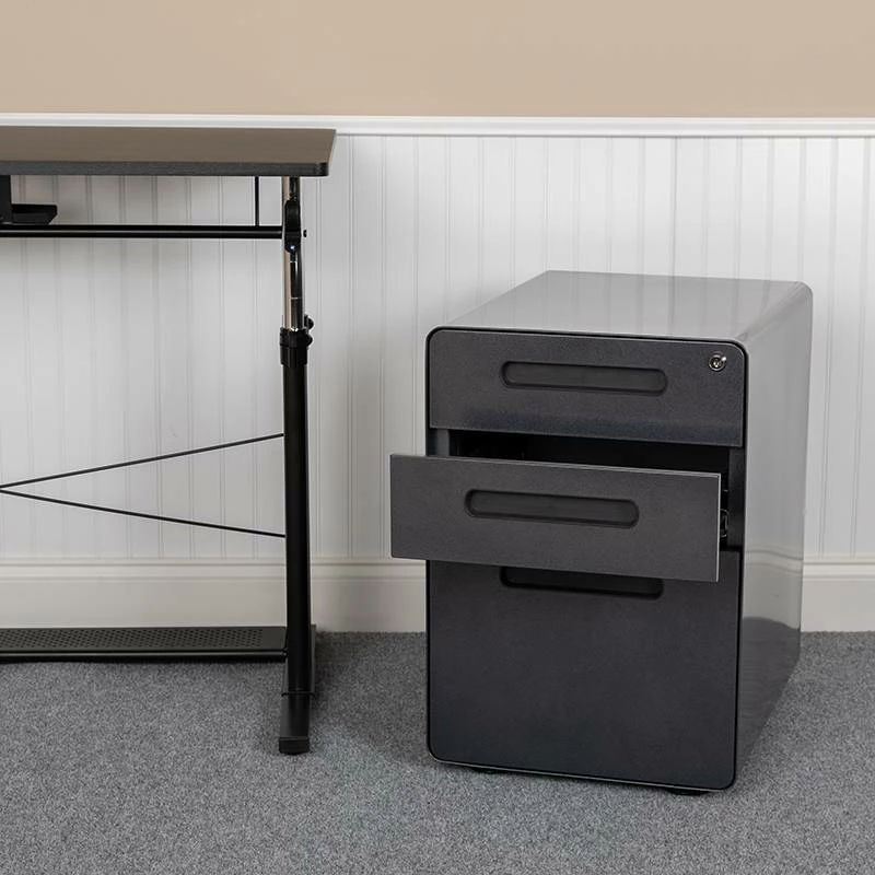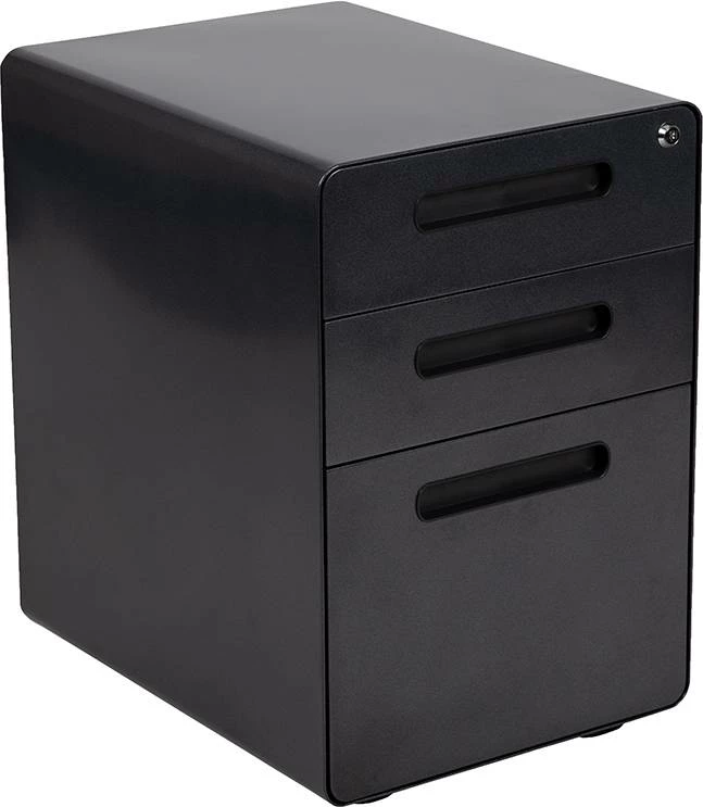 You may love your current desk but have nowhere to store your paperwork without cluttering the desktop, insert this locking file cabinet to keep the minimalistic appearance of your modern office desk. This 3-drawer pedestal file cabinet has low set casters to keep up with the needs of a busy worker. The convenience of casters is ideal for employees who regularly file documents, allowing them the option to pull the cabinet near them while monitoring incoming emails. The modern 3-drawer mobile file cabinet has two utility drawers to hold your small office supplies, snacks, vitamins and writing utensils while the hanging file drawer holds A4, letter, legal, and F4 hanging folders. An included pencil tray keeps your small supplies neatly stored and can be used in either of the two utility drawers. Two keys are included to keep in separate locations or as a duplicate for your assistant. Inset drawer handles provide a modern appearance and a worry-free solution to loosening handle screws. Organize your office space with this mobile under desk filing cabinet that comes fully assembled and ready-to-use. This ergonomic filing cabinet is a smart solution for any workplace whether used for heavy-duty daily filing or the casual user.