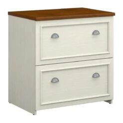 Bring a slice of cottage comfort into your home office and get organized with the Bush Furniture Fairview Lateral File Cabinet. Two large file drawers accommodate letter- or legal-sized files and glide on smooth full-extension ball bearing slides so you can reach anything you need, even items all the way at the back. The Lateral File Cabinet is the same height as the coordinating Fairview L Shaped Desk (sold separately) to extend the work surface area, while the durable design stands up to scratches and stains for a long-lasting professional appearance. Available in Antique Black with Hansen Cherry Accents or Antique White with Tea Maple Accents, the attractive Lateral File Cabinet features Antique Pewter hardware for a look that works anywhere. Fairview meets ANSI/SOHO quality test standards for safety and performance, and comes with a Bush Furniture 6 Year Manufacturer’s Warranty. See the full collection for coordinating items available.