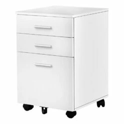 Complete your workstation with this compact and functional mobile file cabinet with a white laminate finish. Easy on the eyes / it can be placed anywhere thanks to 5 casters (2 locking) / and you can complete your collection with a matching office desk (sold separately). Also useful as a printer stand / this filing cabinet is there for you to help you reach your potential no matter the task at hand. Two convenient letter sized drawers easily accommodate files / papers / letters / or books / while the third and bottom drawer handles legal sized documents so that you have multiple convenient storage options. Accented with simple modern white colored handles / this unit has no lack of style.