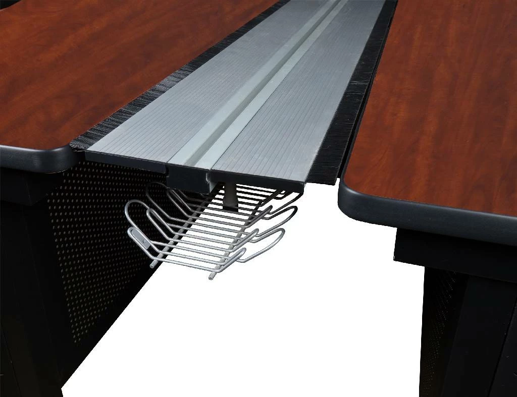 Encourage communication and productivity with the Fusion Benching System- a versatile, open-plan team workstation. Each system includes two desk shells connected by a wire management system that runs the length of the desks. A flip-top cover provides instant access to a wire management tray underneath that keeps cables clear of both desktops and floors for a cleaner office. Cables can run from the wire management trough to the inside of Fusion’s unique wire management C-Legs. Optional frosted plexiglass privacy dividers keep teams focused without isolation. This 48-inch long Benching System is constructed of a 1-inch thick Cherry thermal fused melamine laminate desktop with a black T-Mold edge band. Rounded corners make the table safer for everyone. A durable and modern black metal Fusion desk frame supports the tabletop. Laminates are scratch, stain and scald resistant. Fusion casegoods are backed by a 10-year limited manufacturer’s warranty.