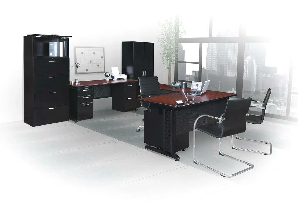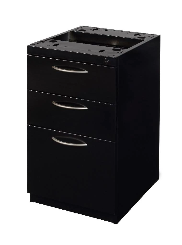 This Box-Box-File Pedestal offers classic filing and storage for any office environment. It attaches seamlessly to any Fusion desk shell, training table, L or U-Desk. It has two box drawers and one file drawer that accepts both letter and legal filing. All drawers lock and have silver colored curved drawer pulls. All Fusion storage components are constructed of high quality metal and finished in a glossy black to match any . Regency takes pride in its country and always looks for ways to keep jobs in America; Fusion storage is made right here in the USA and is backed by a 10-year limited manufacturer’s warranty.