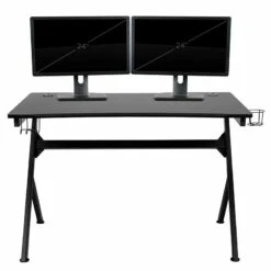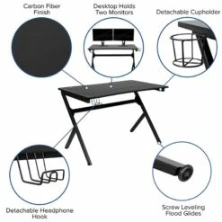 Whether you’re on a quest, building cities from the ground up or taking out zombies, a great gaming desk is a must have. This black gamer workstation features a headphone holder and cupholder to free up your hands and 2 cable management holes to keep you organized. This large computer table is specifically designed to hold your gear and has space for your gaming console and controllers, laptop and other necessities such as dual monitors, a keyboard and a gaming mouse. This PC gaming desk has a spacious, lightweight carbon fiber top that lends superior strength and prevents rust and corrosion while the low thermal expansion properties preserve fiber integrity to extend the lifetime of the desktop. This computer desk for gaming gives you generous leg room and ample space for a desktop tower or a 6 can mini-fridge for those marathon gaming sessions. An ultra strong powder coated steel frame holds up to 110 pounds while the self-leveling floor glides will ensure your platform stays stable. This gaming station desk assembles in less than 30 minutes with the included tools. A premium home office PC table is great for all gamers and will be right at home in your home office, , dorm room, or gaming room. Pair this gaming desk with one of our gaming racing office ergonomic computer PC adjustable swivel chairs for the ultimate experience. [NAN-NJ-TG-D1904-GG]