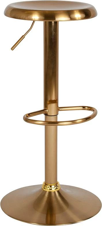 Save a space for this sleek looking modern stool at your kitchen island or countertop. This elegantly contemporary styled gold metal bar stool with its adjustable height and ergonomic molded seat will bring the wow factor to any space you choose, from the kitchen to the recreation room. The sturdy sculpted, straightforward design with the large base and footrest makes this attractive piece a functional work of art, worthy of the spotlight. The comfort molded seat is dipped enough to settle in your seat nicely. This stool boasts a seamless continuity in color and craftsmanship. There is the additional security of a ring underneath to protect your flooring and provide a sense of security that this stool won’t move unless you move it. If you are looking to add some pizazz this gorgeous backless barstool would be a fashionable accent, a perfect accompaniment for any space. [CH-181220-GD-GG]
