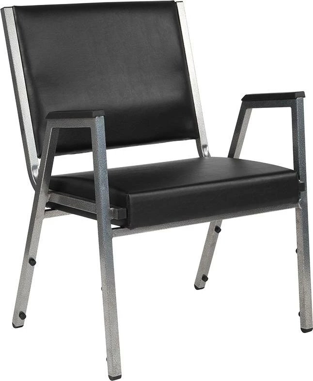 This stackable arm chair is the ideal choice to fit into your reception area to accommodate all users.The antimicrobial upholstery is the premier solution for heavily used areas. The extra wide seat is 21.5″ and has a 2.5″ thick cushion. Chair is constructed with a sturdy 18 gauge tubular frame that can hold up to 1500 lbs. Bumper guards will prevent the finish on the frame from being scratched while stacked while stacking up to 10 chairs.This commercial grade bariatric side chair not only meet the needs in the reception and hospitality industry, but will also make a great addition in your home for additional seating for guests. [XU-DG–BK-VY-GG]