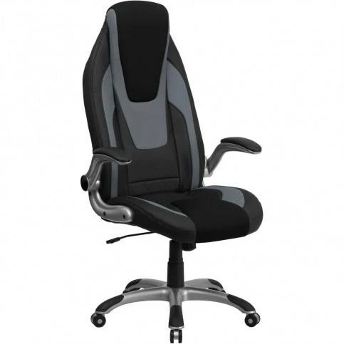 This Contemporary Ergonomic High Back Swivel Office Chair features flip up arms and a silver nylon base with black caps that prevent feet from slipping. The black vinyl upholstery is highlighted with gray vinyl and black mesh insets in the headrest and seat to give this a unique look to make your chair stand apart.