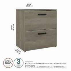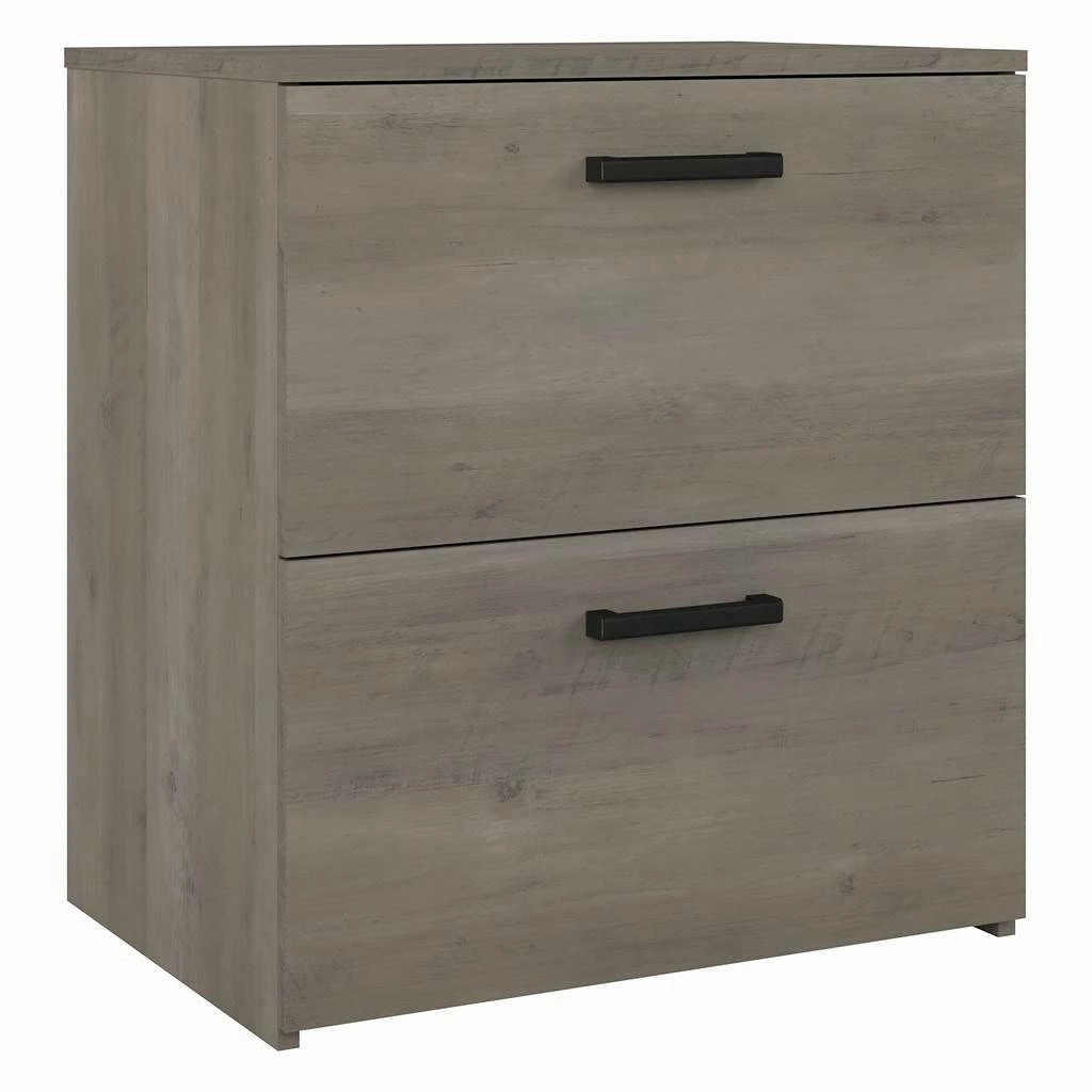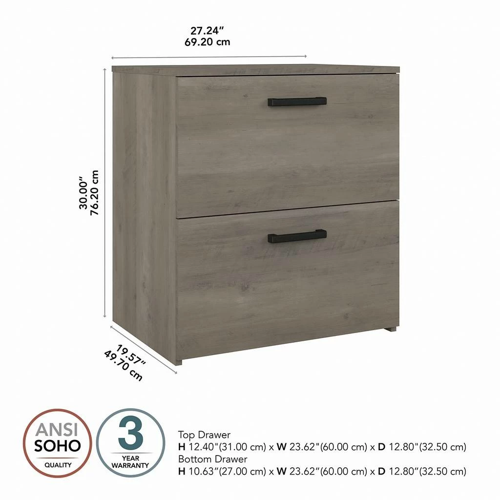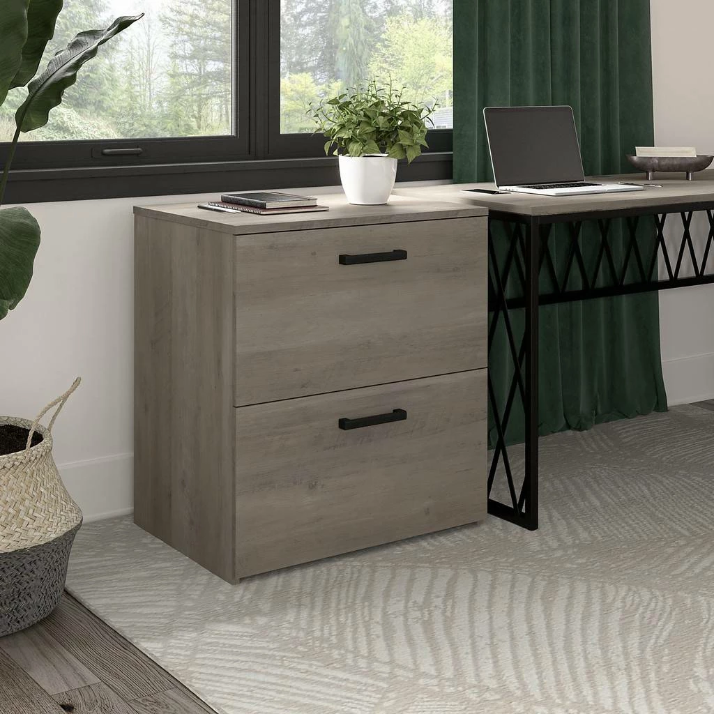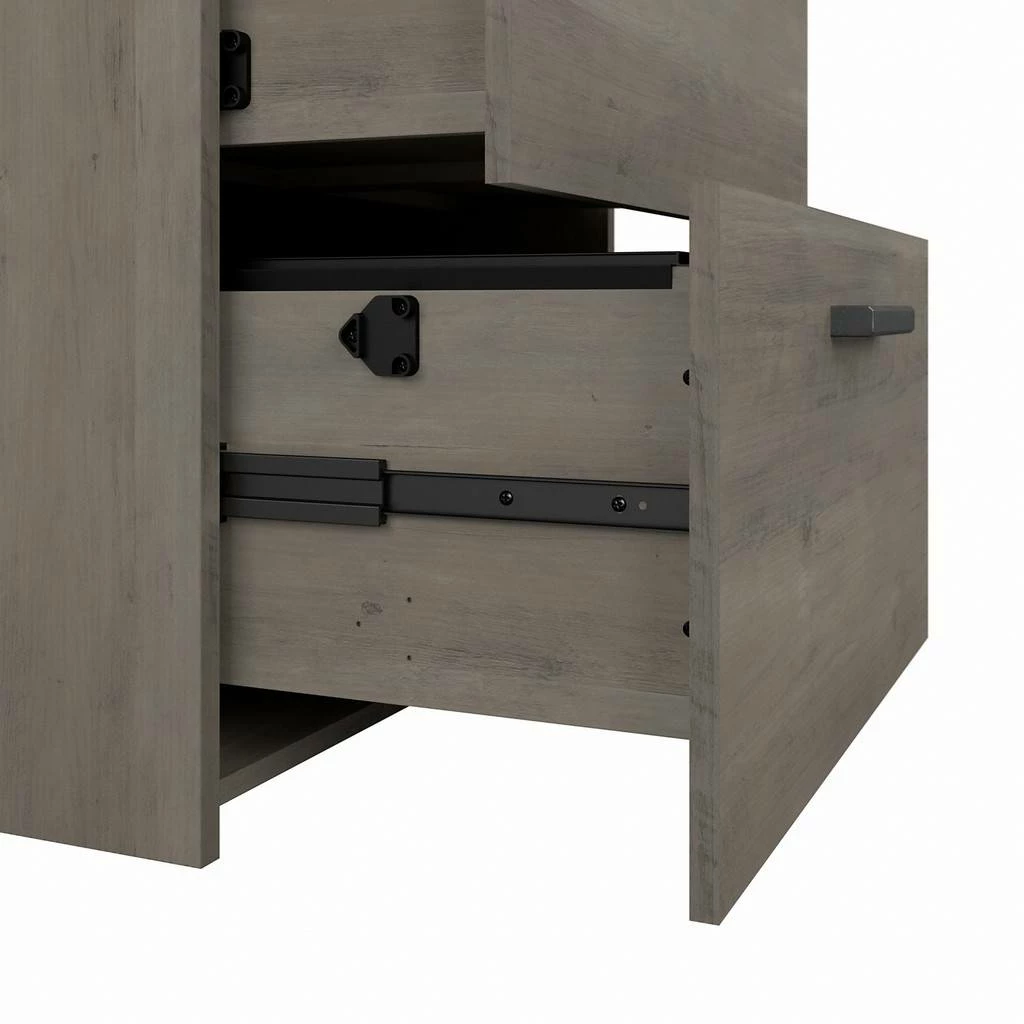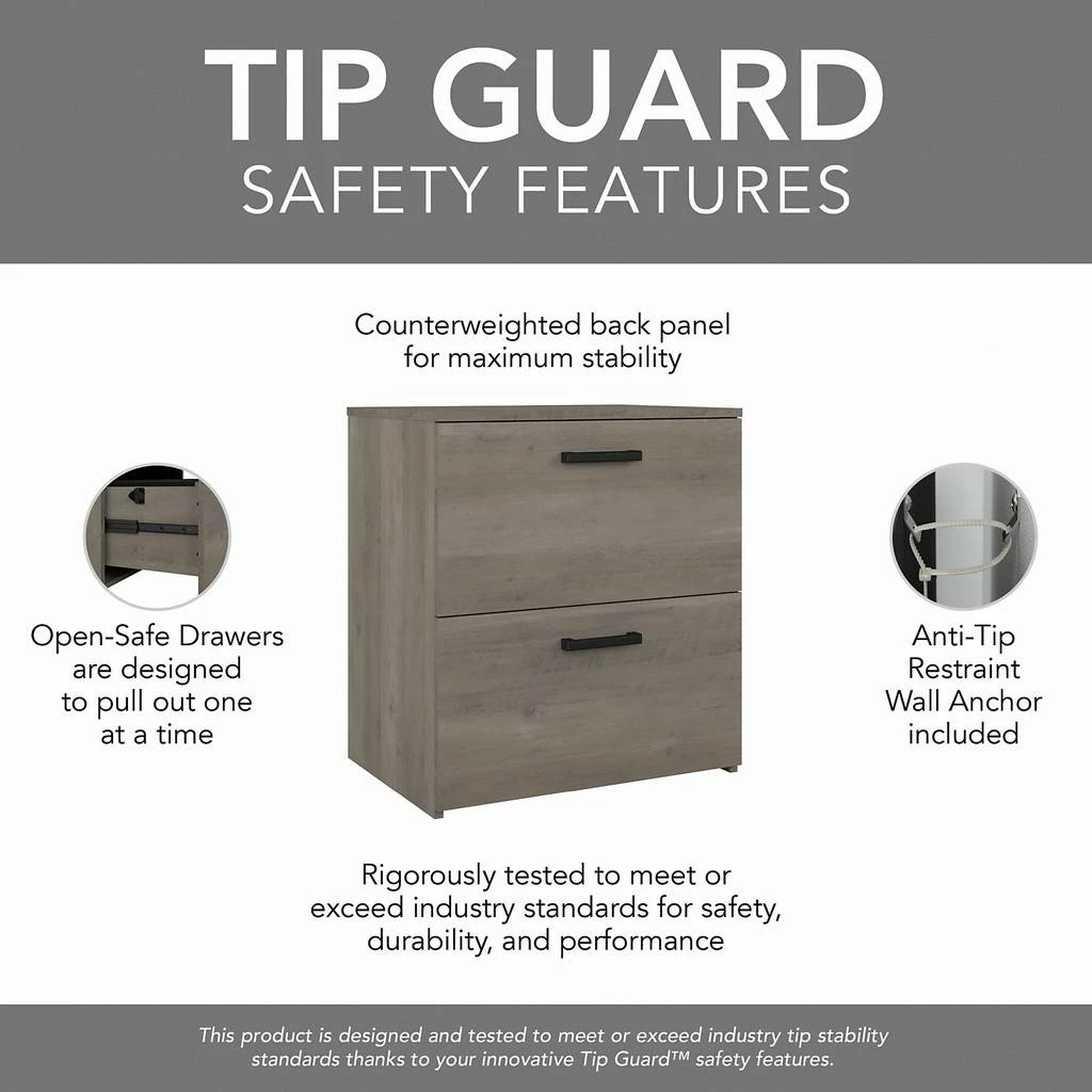 Keep important files and paperwork organized and in order thanks to the kathy ireland Home by Bush Furniture City Park 2 Drawer Lateral File Cabinet. Designed with your safety in mind, this office filing cabinet utilizes our Tip Guard(TM) safety features, which include a stable design, a counterweighted back panel, wall attachment hardware, and Open-Safe Drawers. The file drawers are designed to pull out one at a time for safe and stable use. Each drawer can support up to 50 pounds of letter, legal, and A4-size paperwork. Smooth full-extension ball-bearing slides provide easy reach to your documents. This filing cabinet’s rustic finish and Wrought Iron hardware create a singular modern industrial look. Place your Lateral File Cabinet next to a City Park desk (sold separately) of the same height to extend your work surface. This 2 drawer file cabinet is tested to meet ANSI/SOHO quality standards for safety and performance and is backed by the Bush Furniture 3 Year Manufacturer’s Warranty. See the full City Park Collection for coordinating items to create a cohesive in your office.