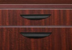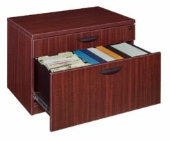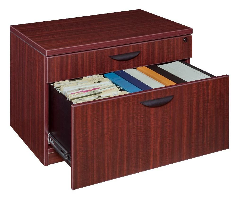 The Legacy Storage Collection offers it all from combo files and bookcases to stackable storage and laterals. This low lateral file stands at only 20-inches high, making it a perfect fit for underneath desks or in tight spaces. Use on its own for a compact storage solution that can double as extra seating or as part of a larger desk system. It has one box drawer and one lateral drawer that accepts letter and legal files. Both drawers lock and have curved black drawer pulls. Finished in a classic Mahogany laminate, storage components coordinate with other Legacy furniture which makes customizing easy. The Legacy collection is constructed of a 1-inch thick thermal fused melamine laminate with a 3-millimeter commercial grade matching PVC edge. Laminates are scratch, stain and scald resistant. Legacy casegoods are backed by a 10-year limited manufacturer’s warranty.