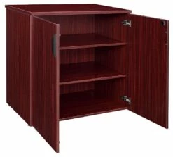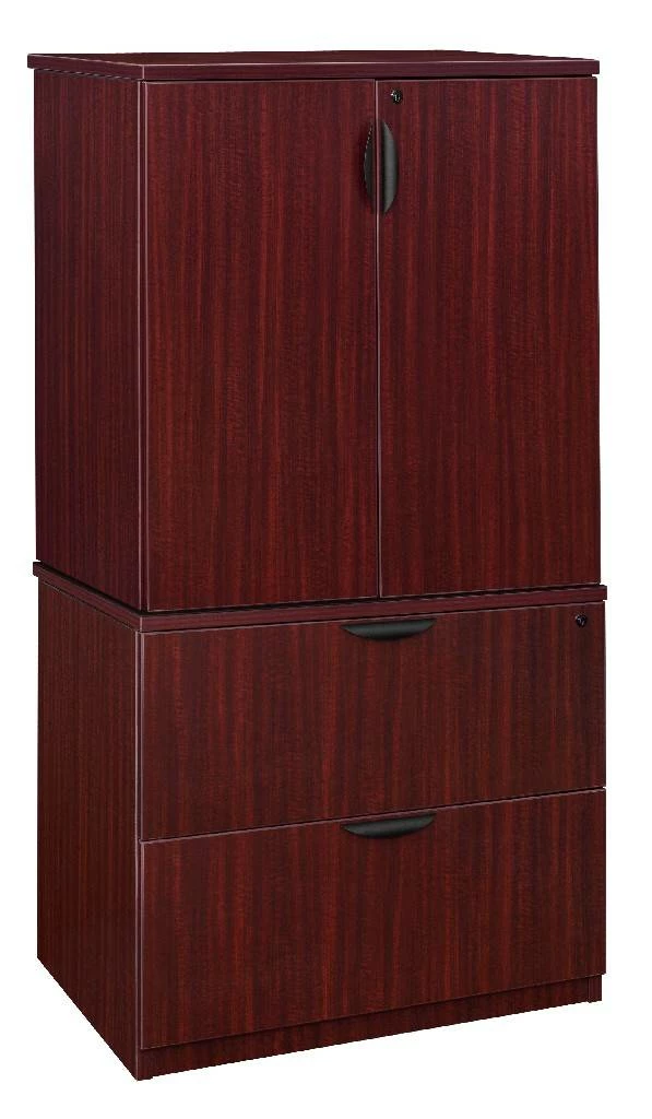 The Legacy Storage Collection offers it all from combo files and bookcases to stackable storage and laterals. This storage set includes one Lateral File and one Stackable Storage Cabinet. It is a great accent to private offices, filing rooms and more. The Lateral has two large full suspension drawers that accept both letter and legal filing. Both drawers lock and include ergonomically designed drawer pulls for convenience and ease in operation. The Storage Cabinet has two locking doors that open to a spacious interior with two adjustable shelves that can be moved in 1-inch increments. When stacked on top of the lateral and used for common supplies, it can ease stress from bending over to reach supplies stored near the floor. Finished in a classic Mahogany laminate, storage components coordinate with other Legacy furniture which makes customizing easy. The Legacy collection is constructed of a 1-inch thick thermal fused melamine laminate with a 3-millimeter commercial grade matching PVC edge. Laminates are scratch, stain and scald resistant. Legacy casegoods are backed by a 10-year limited manufacturer’s warranty.