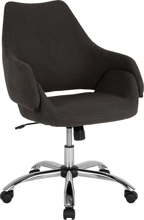 Explore new heights in this Upholstered Mid-Back Swivel Office Chair.Offering a fresh new look, this chair has a curvaceous frame with arms that curve with the frame. Chair easily swivels 360 degrees to get the maximum use of your workspace without strain. Raise and lower your seat height using the pneumatic seat height adjustment lever, conveniently located under the seat. A heavy duty chrome base with dual wheel casters makes it easy to roll across the floor. The slight open back finishes the look and charm of this chair.Browse and get tasks completed in this chair that is perfect for the office or home office.