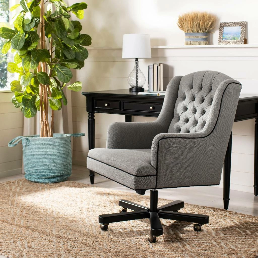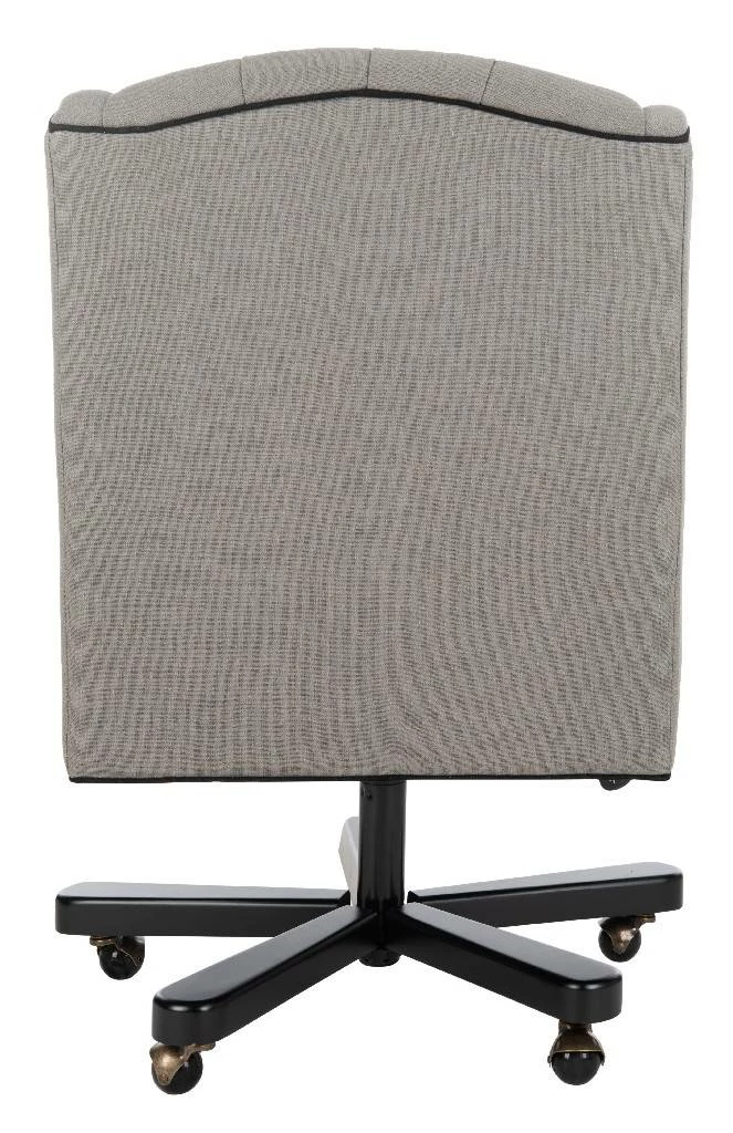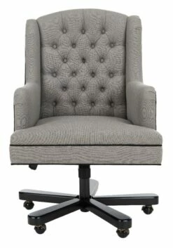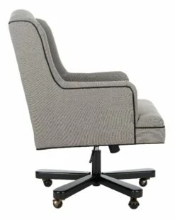 Inspired by elegant English clubhouse seating, this high back biscuit tufted desk chair is lavishly upholstered in granite linen with contrasting black cording. Designed for ergonomic comfort this office chair glides on a black metal base with casters.