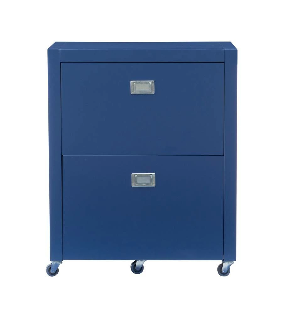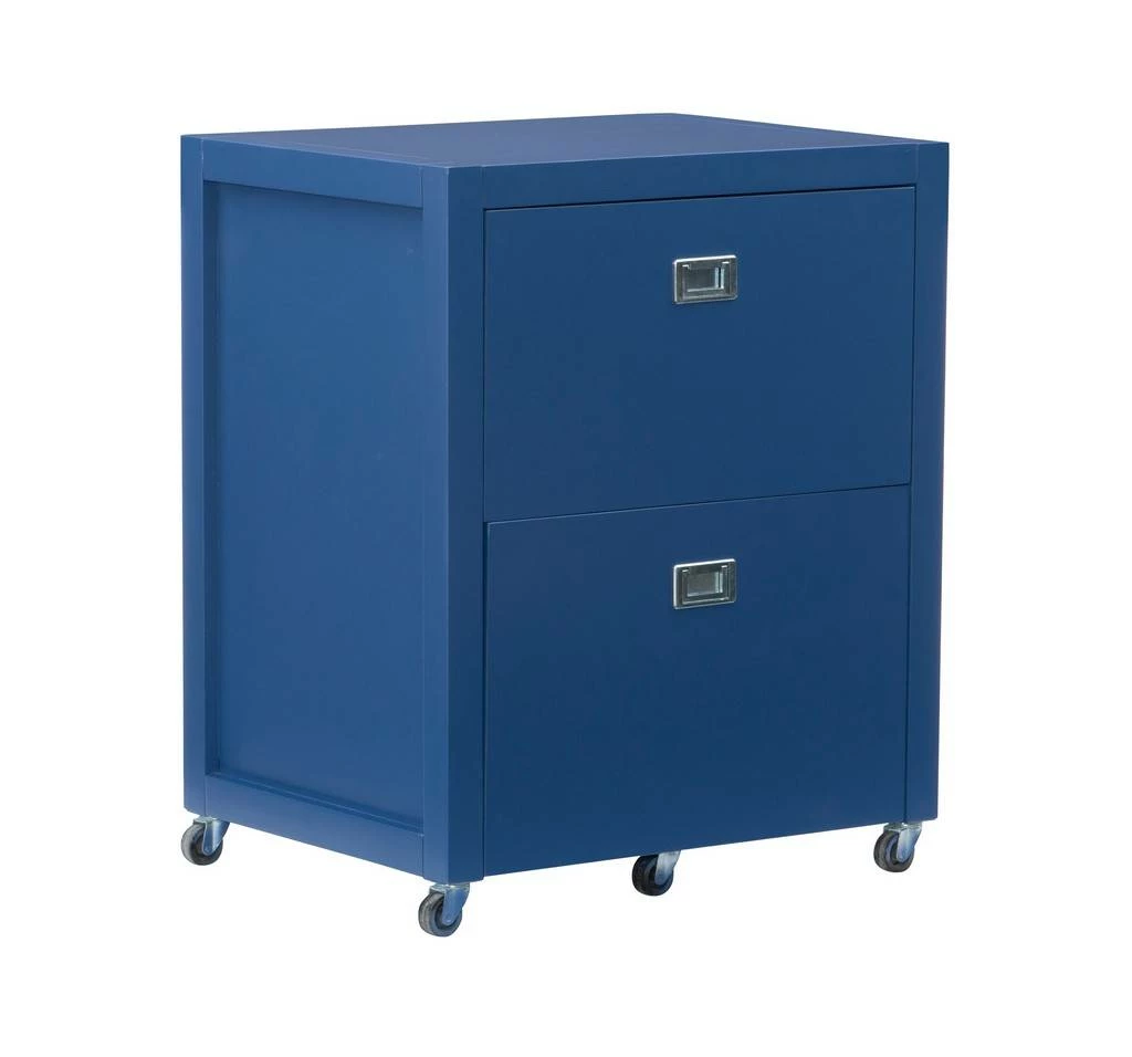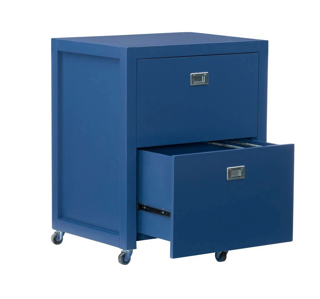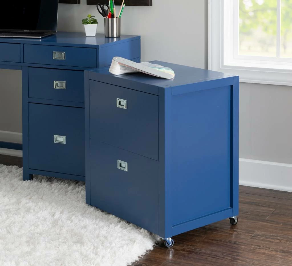 Make work more fun with this campaign style file cabinet. Finished in navy blue with silver hardware, this multipurpose piece will add color and organization to any workspace. The top drawer offers ample space for supplies, while the bottom one features adjustable rails for letter or legal sized hanging folders. Both are equipped with metal glides. At nearly 27”, it is a perfect height for placing a printer on top. The cabinet also comes with locking wheels, making it easy to move, but only when it you want it to.
