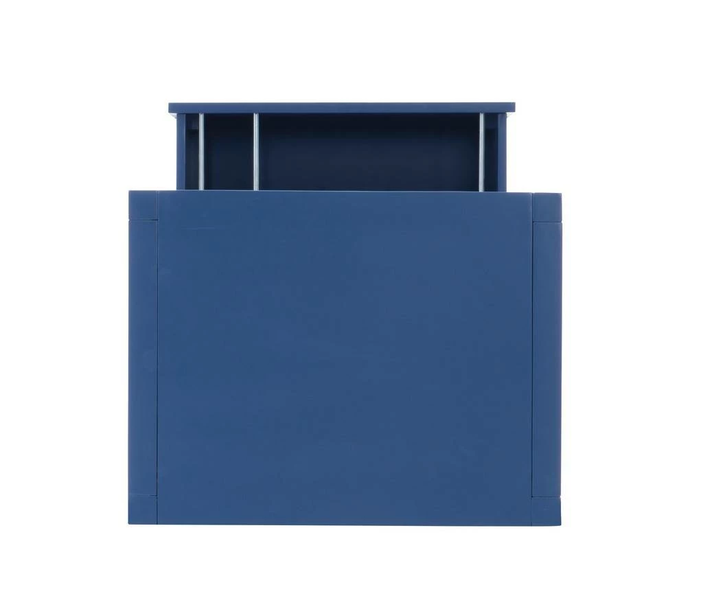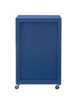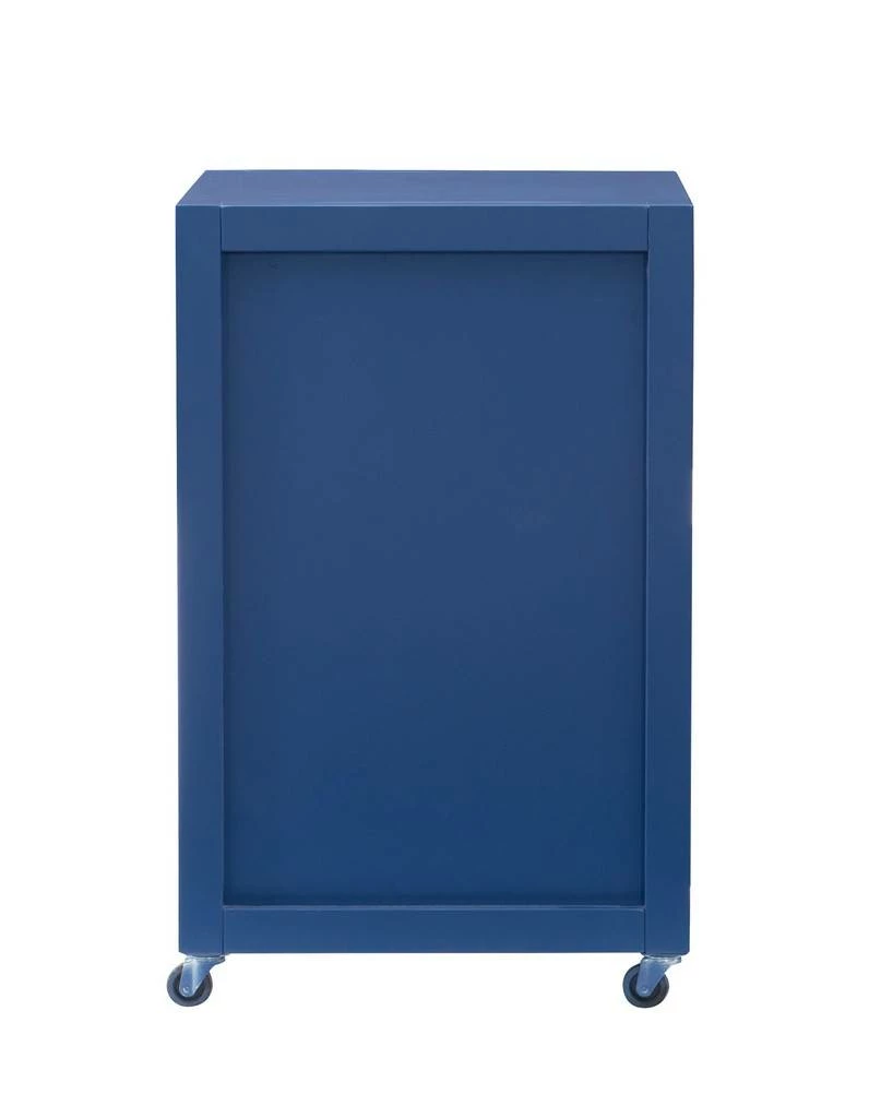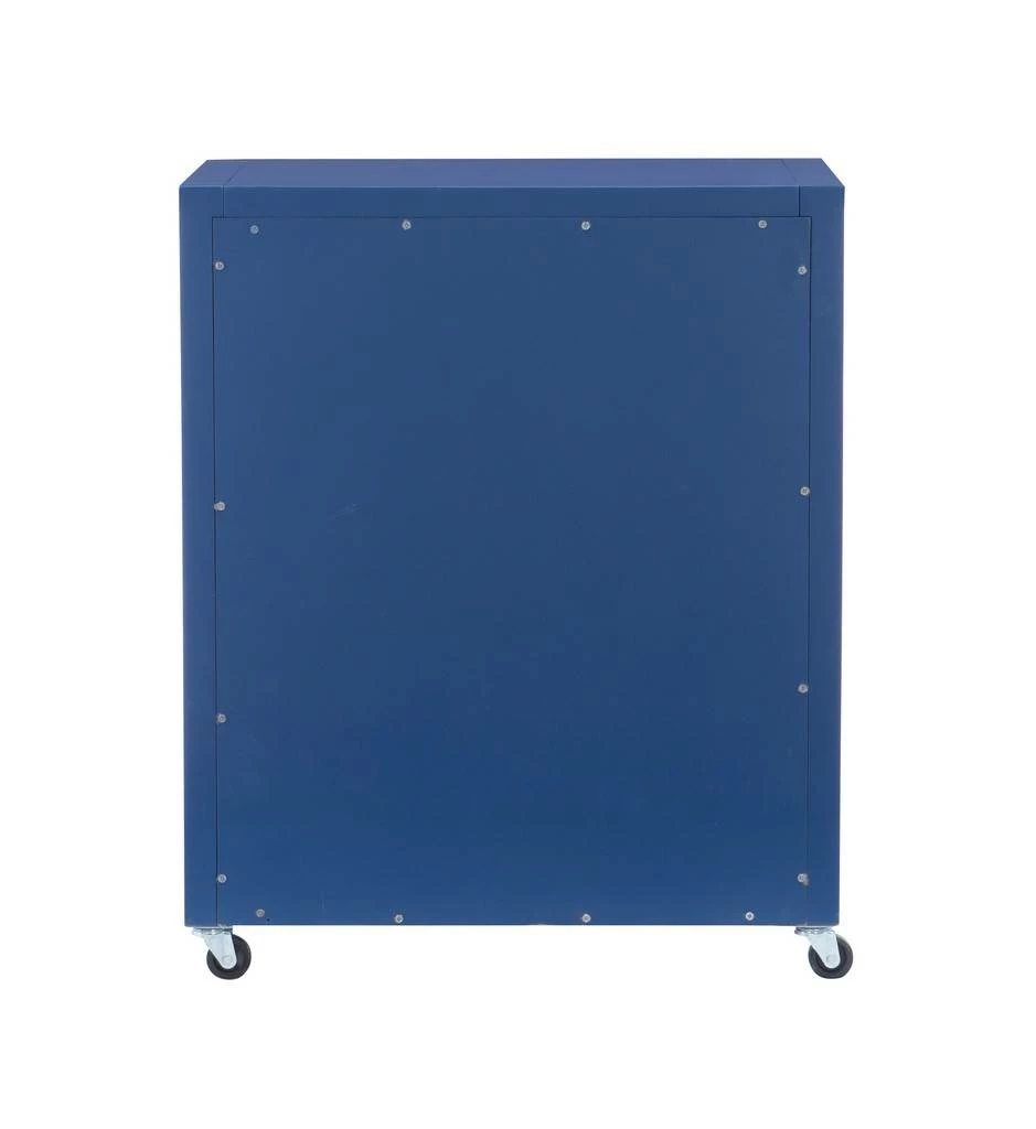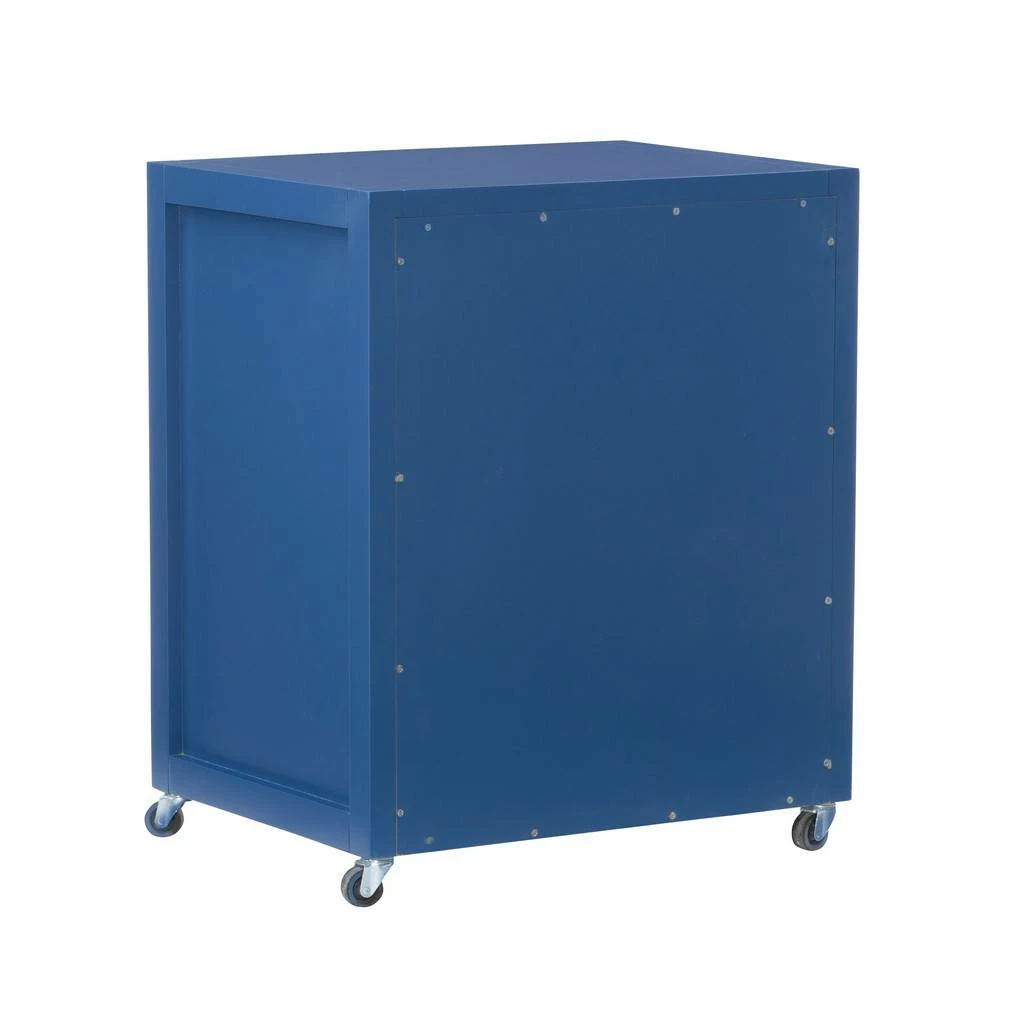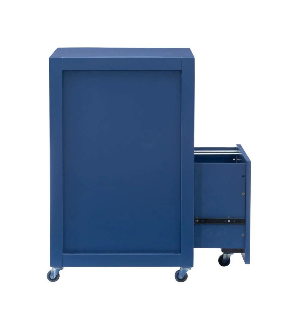 Make work more fun with this campaign style file cabinet. Finished in navy blue with silver hardware, this multipurpose piece will add color and organization to any workspace. The top drawer offers ample space for supplies, while the bottom one features adjustable rails for letter or legal sized hanging folders. Both are equipped with metal glides. At nearly 27”, it is a perfect height for placing a printer on top. The cabinet also comes with locking wheels, making it easy to move, but only when it you want it to.