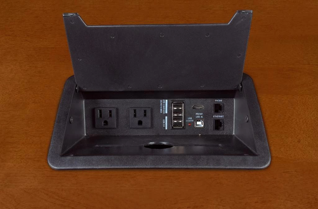 Outfit your executive or home suite with a tradition that lasts. Regency’s Prestige Collection combines the quintessential elements of traditional elegance with classic lines, solid wood trim, beveled edge details and rich hand-rubbed Cherry veneer finishes. Tasteful, two-tone inlaid edge detailing and alternating wood grains set these tables apart. Prestige’s patented modular conference tables grow with the size of your team. Measuring 16 feet long, this luxurious table seats 14 to 16 people. Two Power and Data Ports makes tabletop connectivity easy. Each Power/Data port includes (2) USB 2.0 ports, (2) USB charging ports, (2) AC 125V 60Hz outlets, (1) front/rear ethernet port, (1) front/rear phone port and has a black cover plate for a neat, clean look.