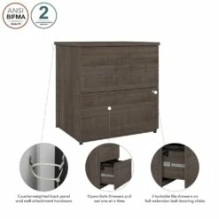The Bestar Ridgeley 2 Drawer Lateral File Cabinet is the perfect paperwork storage solution for any office. This file cabinet allows you to keep your various files, documents, and office supplies organized and in order. The large file cabinet is designed with our Tip Guard™ safety features, which include a stable design, a counterweighted back panel, a wall anchor, and Open-Safe Drawers. Thanks to its fully finished back panel, the lateral filing cabinet can be placed anywhere in your office. Use the durable melamine surface as an additional storage spot for a printer. Each drawer opens on smooth full-extension ball-bearing slides for an effortless open and close. The drawers are designed to accommodate files of various sizes for your convenience. A lock secures both drawers to protect sensitive information. Add some style and personality to your office by displaying decorative items, plants, and pictures on top of the cabinet. The lateral filing cabinet’s classic design allows it to blend easily into any existing office style. This storage solution is tested to meet ANSI/BIFMA quality standards for safety and performance. This 2 Drawer Lateral File Cabinet is backed by the Bestar 2 Year Manufacturer’s Warranty. See the full Ridgeley Collection to create your ideal office space with a desk, bookcase, and more (coordinating items sold separately).