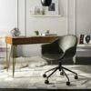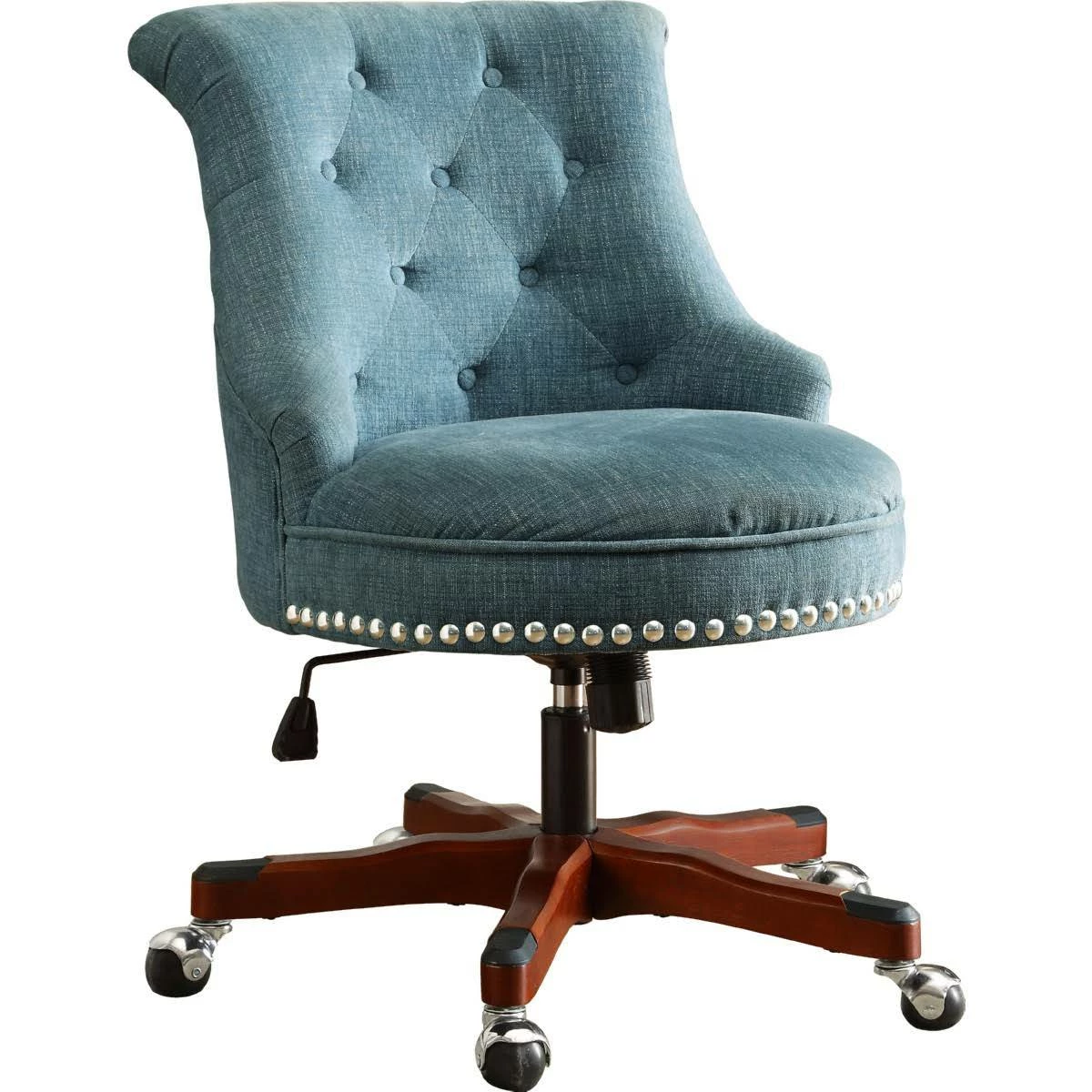 Add style and function to your office with the Sinclair Office Chair. The soft, plush frame features a button tufted back and is upholstered in an aqua fabric. Silver nailheads accent the chair. A dark walnut wood base has metal casters for ease of mobility. Perfect for a home work space or the office.