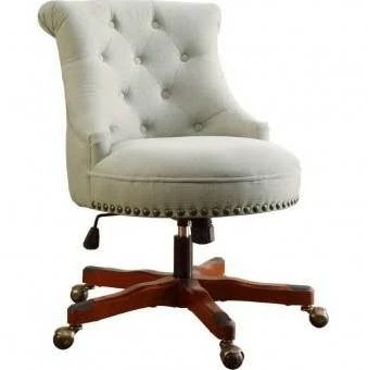 Add style and function to your office with the Sinclair Office Chair. The soft, plush frame features a button tufted back and is upholstered in a natural fabric. Antique Bronze nailheads accent the chair. A dark walnut wood base has metal casters for ease of mobility. Perfect for a home work space or the office.